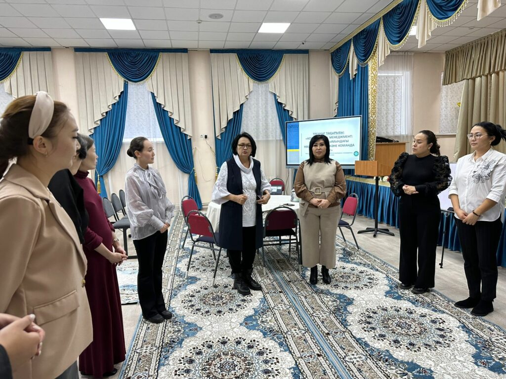 Тренингтің алғашқы сессиясында табысты команда құру қажеттіліктерін қалыптастыру, команда мен топтың ұқсастықтары мен айырмашылықтарының ара-жігін ажырату, команданың қалыптасу және даму кезеңдерін зерделеу, тиімді команда құру мен басқарудың стратегиясын меңгеру және тәжірибеде қолдану мәселелері қарастырылды. Қатысушылар тимбилдингтік тапсырмаларды орындап, командалық менеджменттің мектеп үшін маңыздылығын ашатын кәсіби талқылаулар, ашық сұрақтар алаңы, жаттығулар мен ойындарға аса белсенділікпен қатысты.