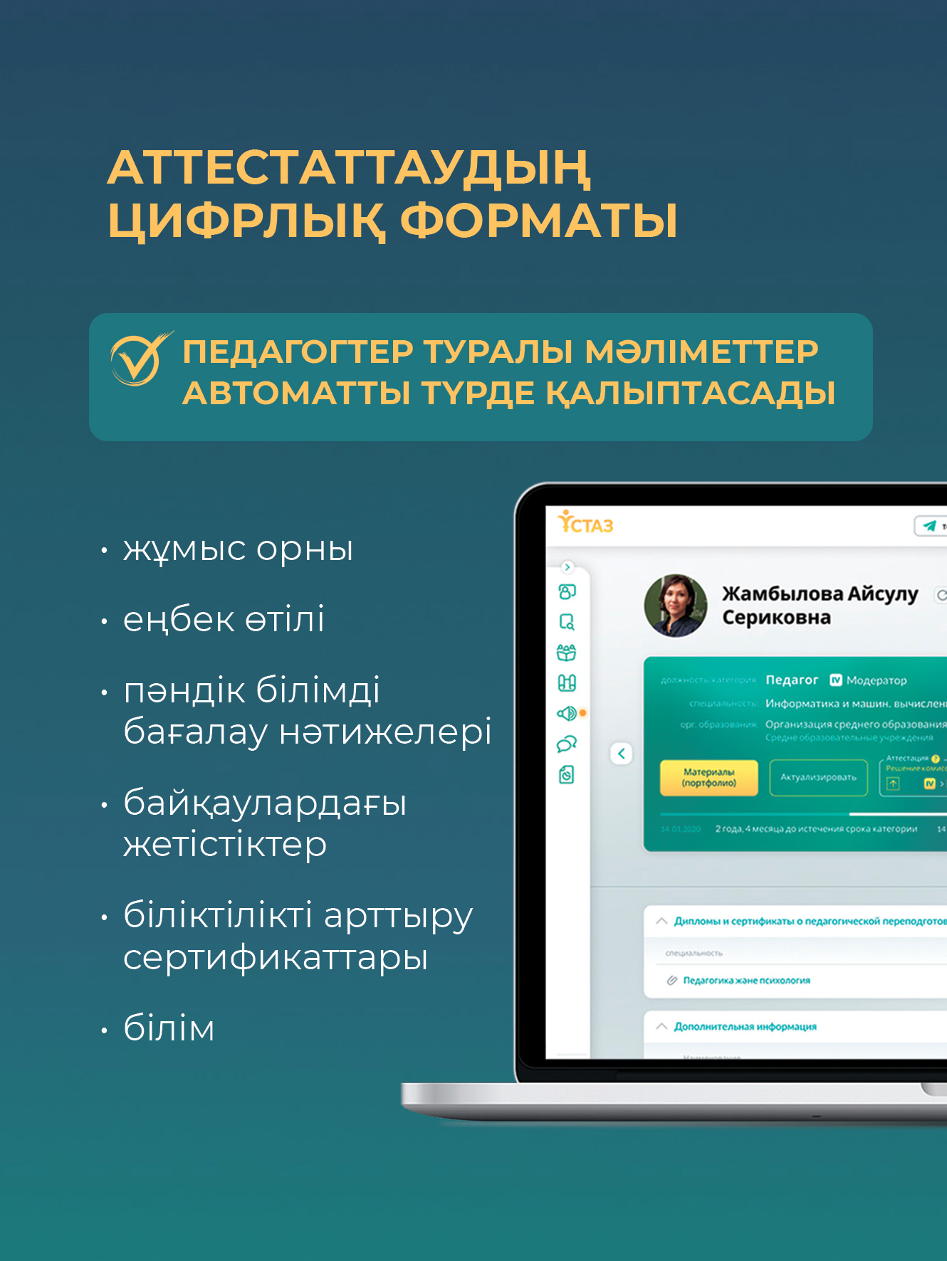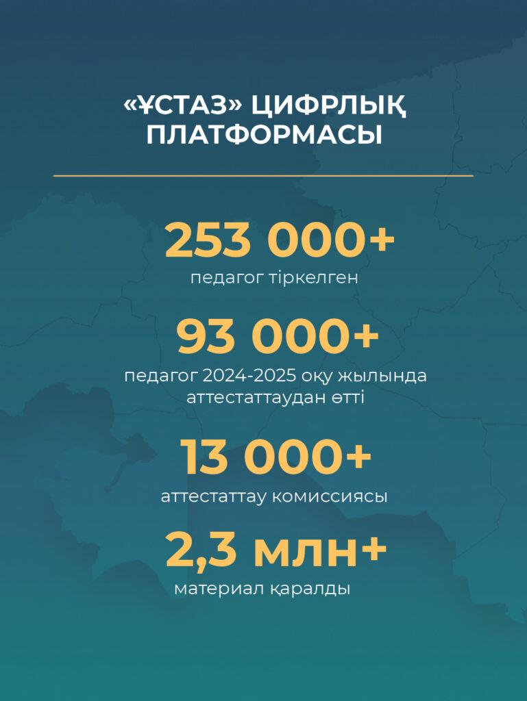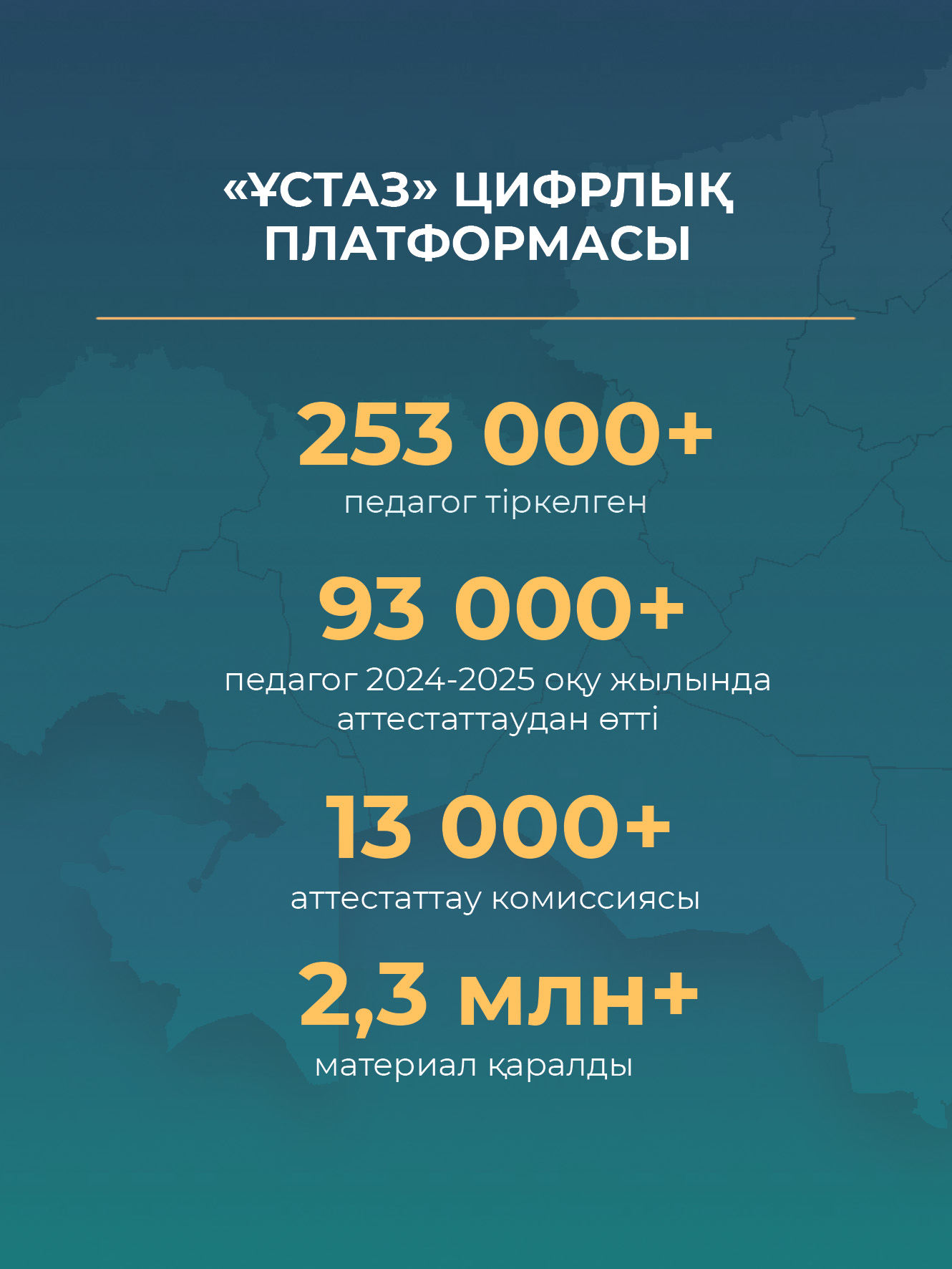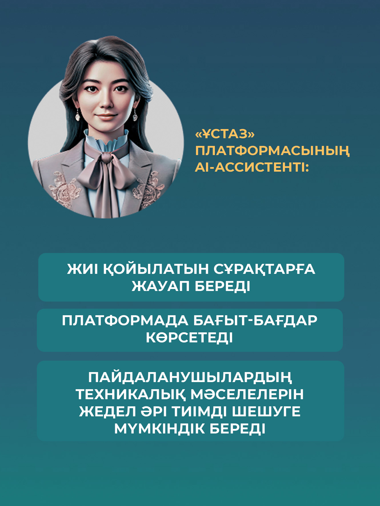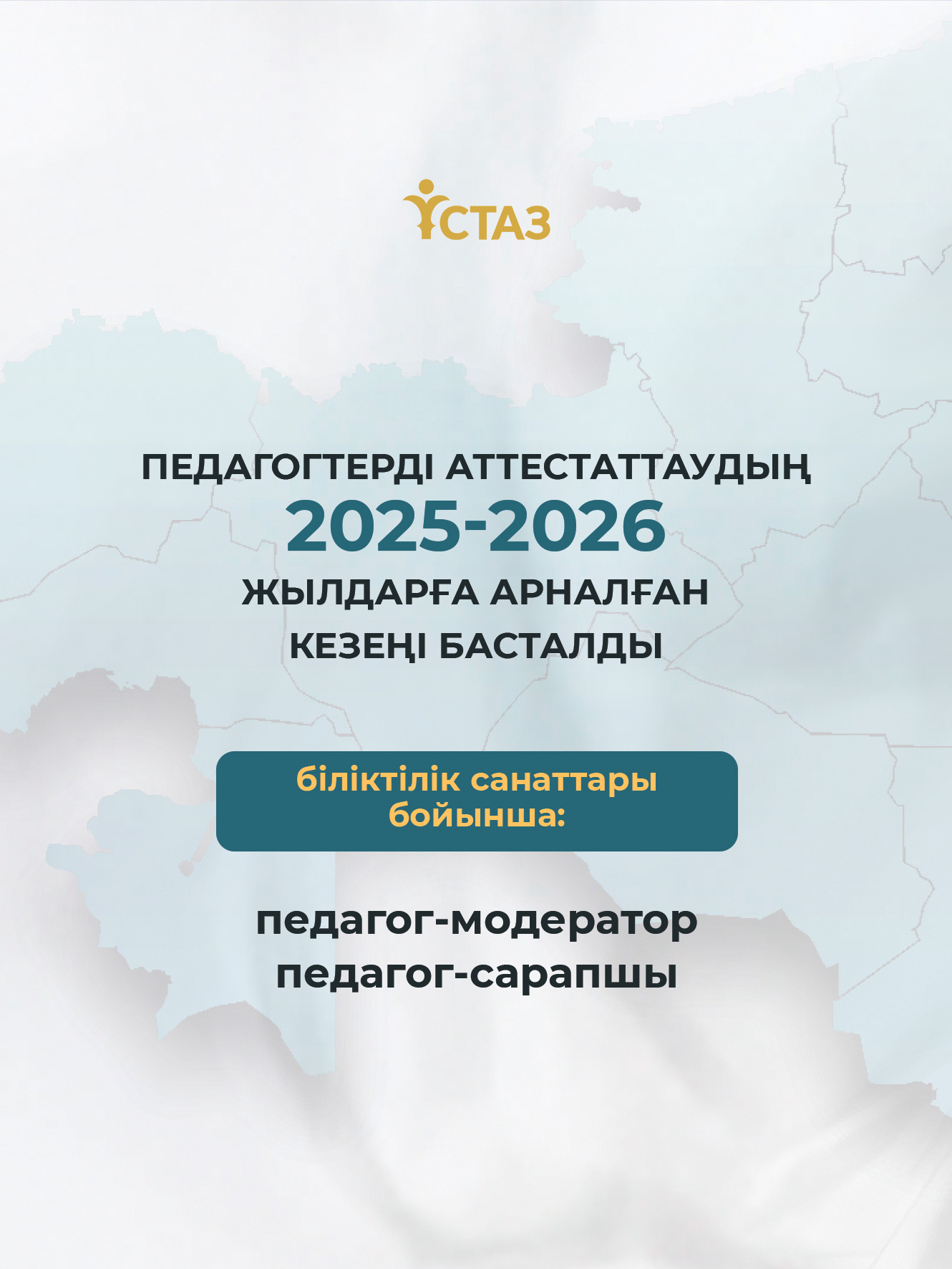«Ұстаз» цифрлық платформасында педагогтерді 2025–2026 жылына арналған аттестаттау кезеңі басталды. «Педагог-модератор» және «педагог-сарапшы» санаттары бойынша аттестаттау үдерісі толықтай цифрлық форматта жүзеге асырылады. Педагогтер туралы мәліметтер бірқатар мемлекеттік ақпараттық жүйелермен интеграцияланған. Сонымен қатар платформада аттестаттау мәселелері бойынша жиі қойылатын сұрақтарға жауап беріп, техникалық мәселелерді жедел шешуге көмектесетін AI-ассистент іске қосылды.