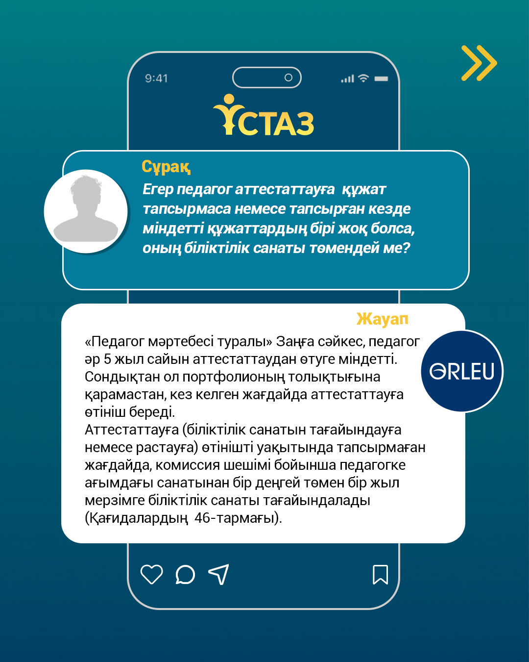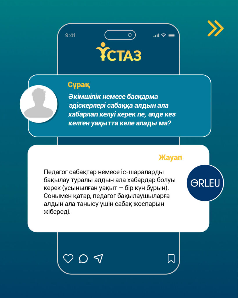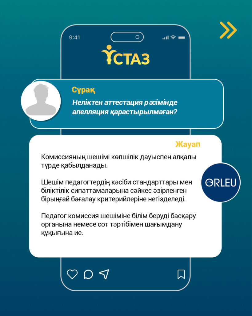 ҚР Оқу-ағарту министрлігі «Өрлеу» БАҰО-ның ресми әлеуметтік желі парақшаларында «Ұстаз» цифрлық платформасын пайдалану және аттестаттау тәртібіне қатысты өзекті сұрақтарға тұрақты түрде түсіндірме беріліп келеді. Сондай-ақ, бүгінде педагогтерге әдістемелік және техникалық қолдау көрсету мақсатында еліміздің барлық өңірінде жүйелі ақпараттық-түсіндіру жұмыстары жүзеге асырылуда.