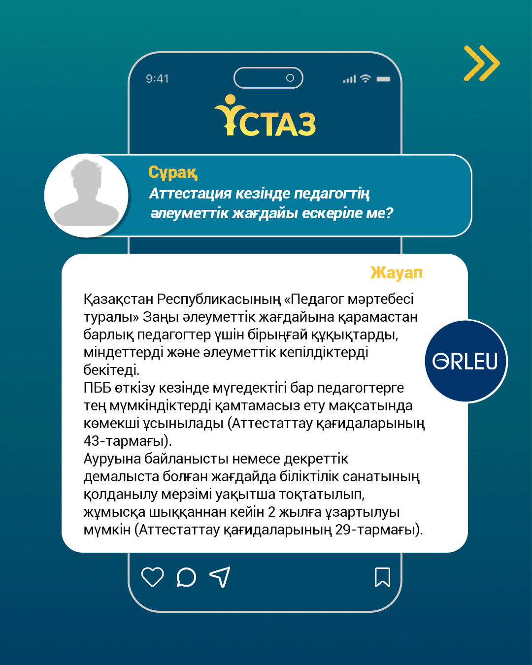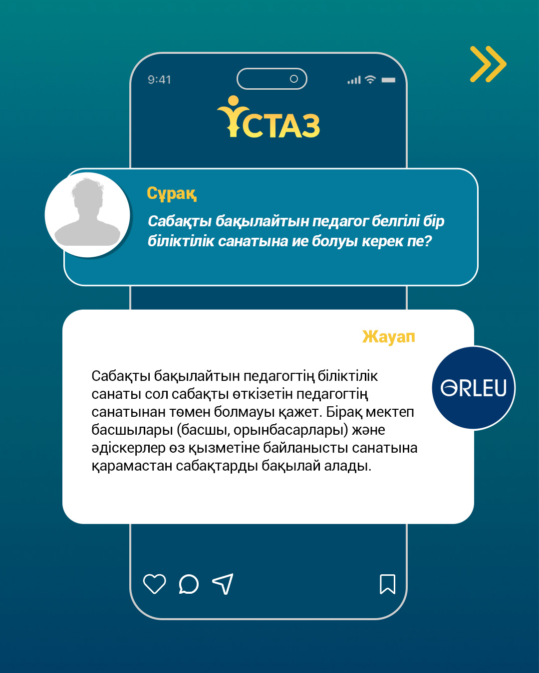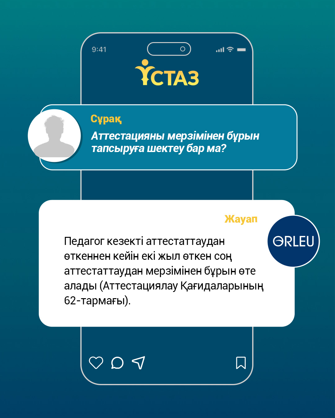 ҚР Оқу-ағарту министрлігі «Өрлеу» БАҰО-ның ресми әлеуметтік желі парақшаларында «Ұстаз» цифрлық платформасын пайдалану және аттестаттау тәртібіне қатысты өзекті сұрақтарға тұрақты түрде түсіндірме беріліп келеді. Сондай-ақ, бүгінде педагогтерге әдістемелік және техникалық қолдау көрсету мақсатында еліміздің барлық өңірінде жүйелі ақпараттық-түсіндіру жұмыстары жүзеге асырылуда.