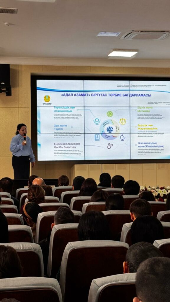 «Өрлеу» БАҰО» АҚ Шымкент қаласы бойынша Кәсіби даму институтының директоры, филология ғылымдарының кандидаты Медетбекова Меруерт Аскарбековна «Адал азамат» біртұтас тәрбие бағдарламасының құндылықтарын тәрбие үдерісі мен пән мазмұнына кіріктіру» тақырыбында мазмұнды баяндама жасап, бағдарламаның негізгі бағыттары мен әдістемелік ерекшеліктерін таныстырды.