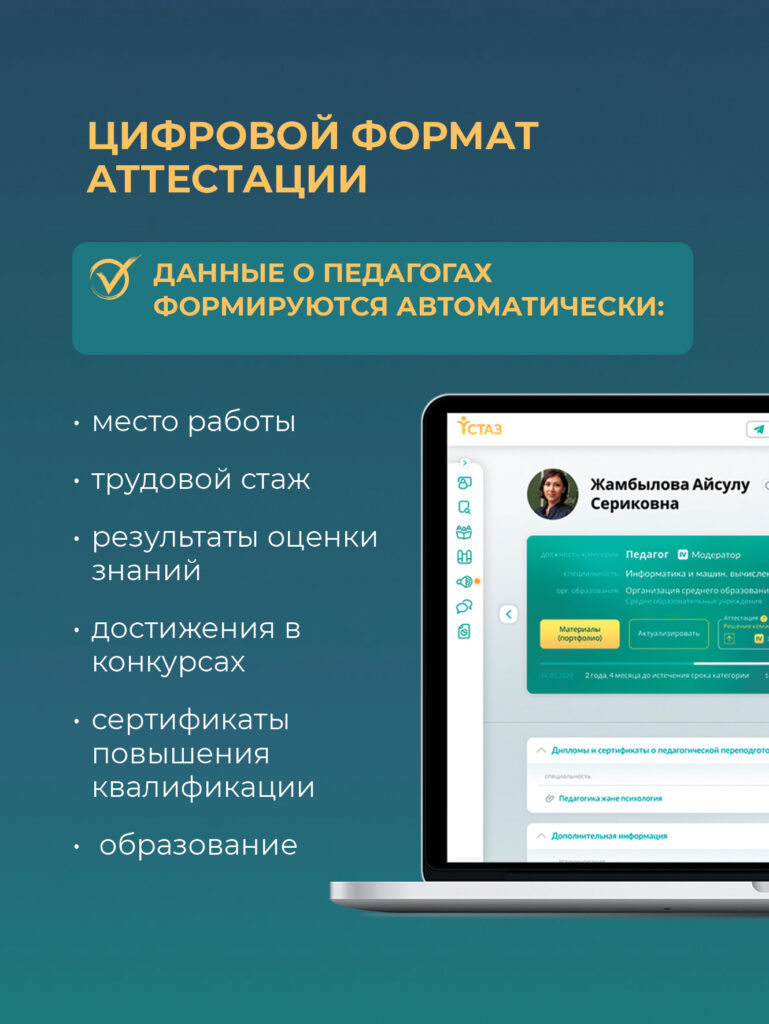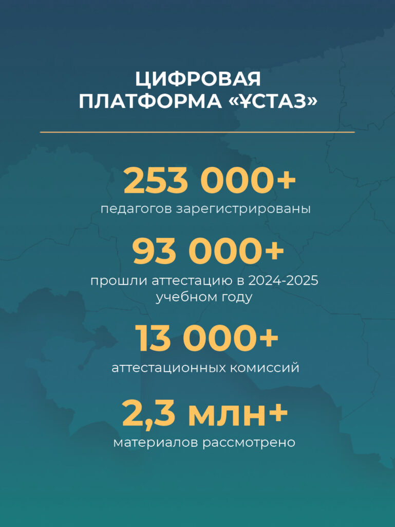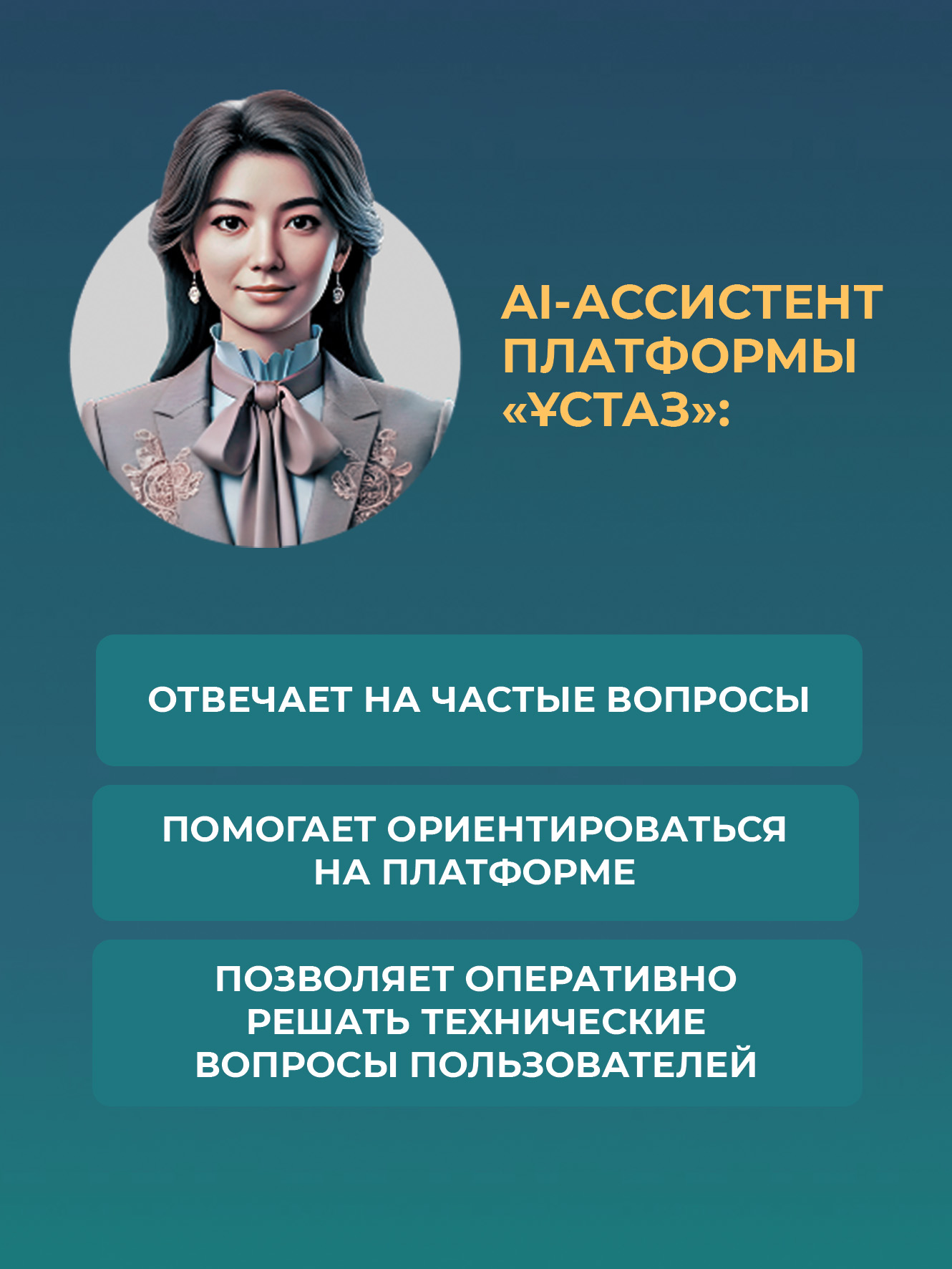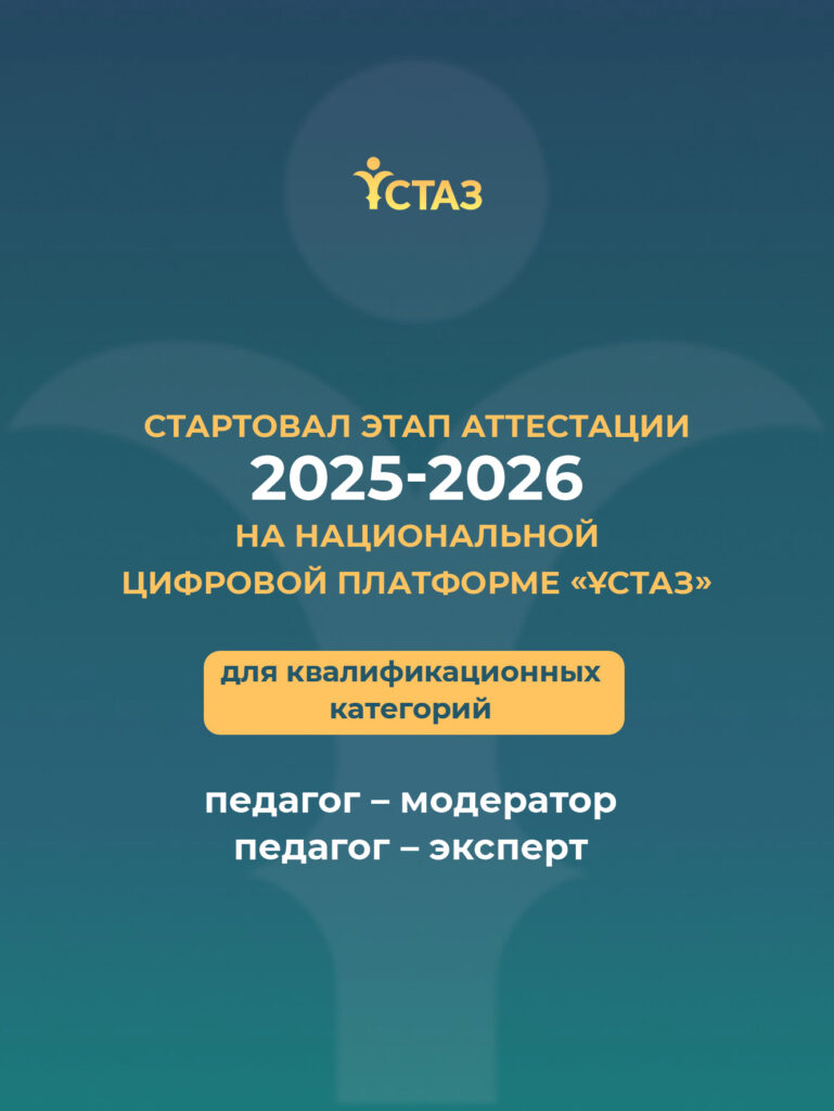 На цифровой платформе «Ұстаз» стартовал период аттестации педагогов на 2025–2026 учебные годы. Процедура аттестации по категориям «педагог-модератор» и «педагог-эксперт» осуществляется полностью в цифровом формате. Сведения о педагогах интегрированы с рядом государственных информационных систем. Кроме того, на платформе запущен AI-ассистент, который отвечает на часто задаваемые вопросы по аттестации и помогает оперативно решать технические вопросы.