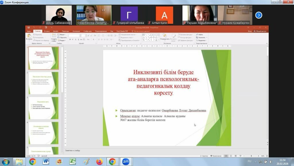Семинар аясында білім берудің теориялық негіздері, оның ішінде инклюзивті білім берудің мәні, мақсаты мен принциптері туралы мәселелер қозғалды. Қатысушылар ерекше білім беру қажеттіліктері бар оқушыларды оқыту барысында кездесетін қиындықтар мен мүмкіндіктерді талқылап, тәжірибелік мысалдармен бөлісті.